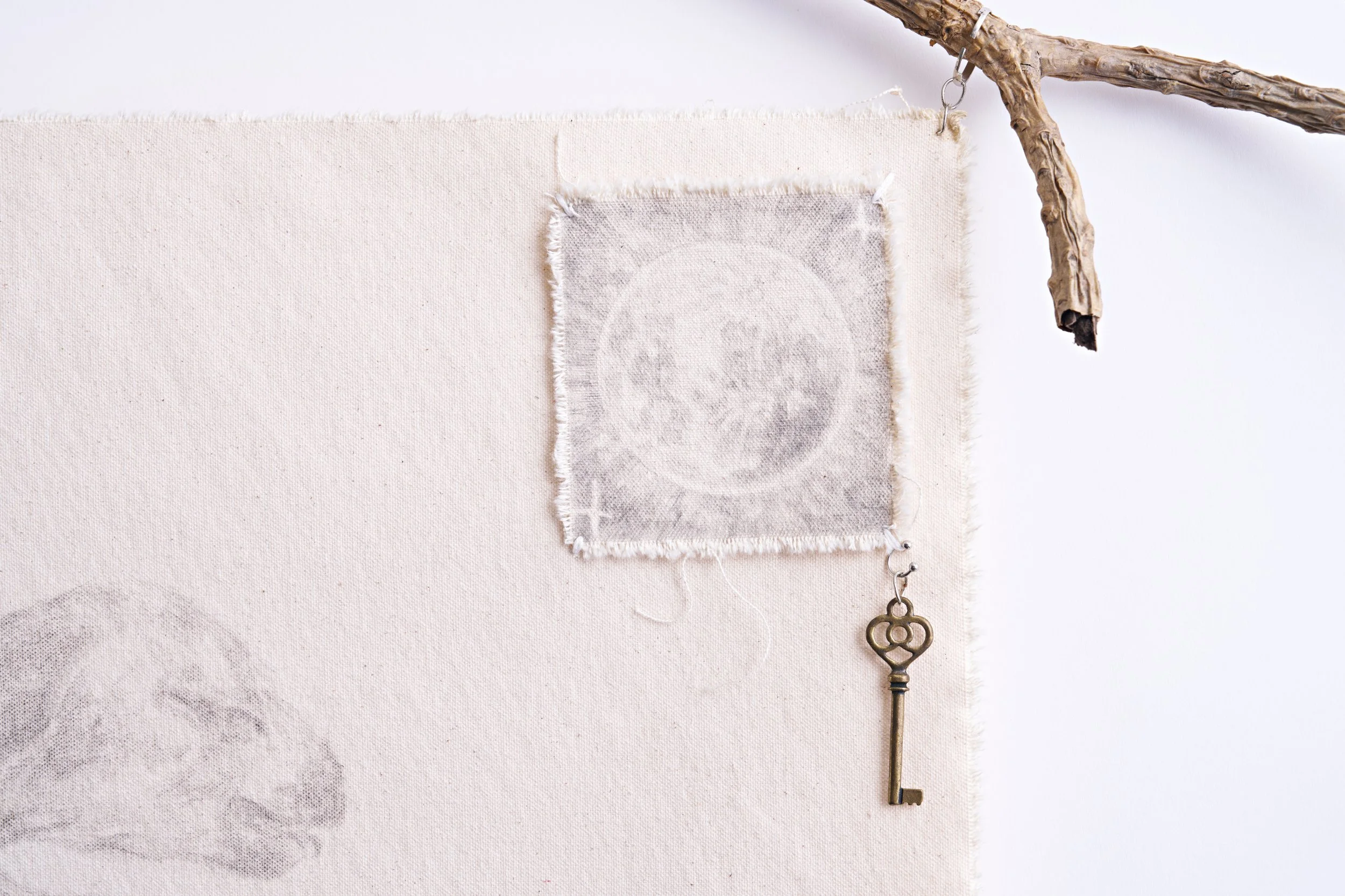 graphite on raw canvas, steel piercings, childhood rosary and charms, found kalachuchi branch